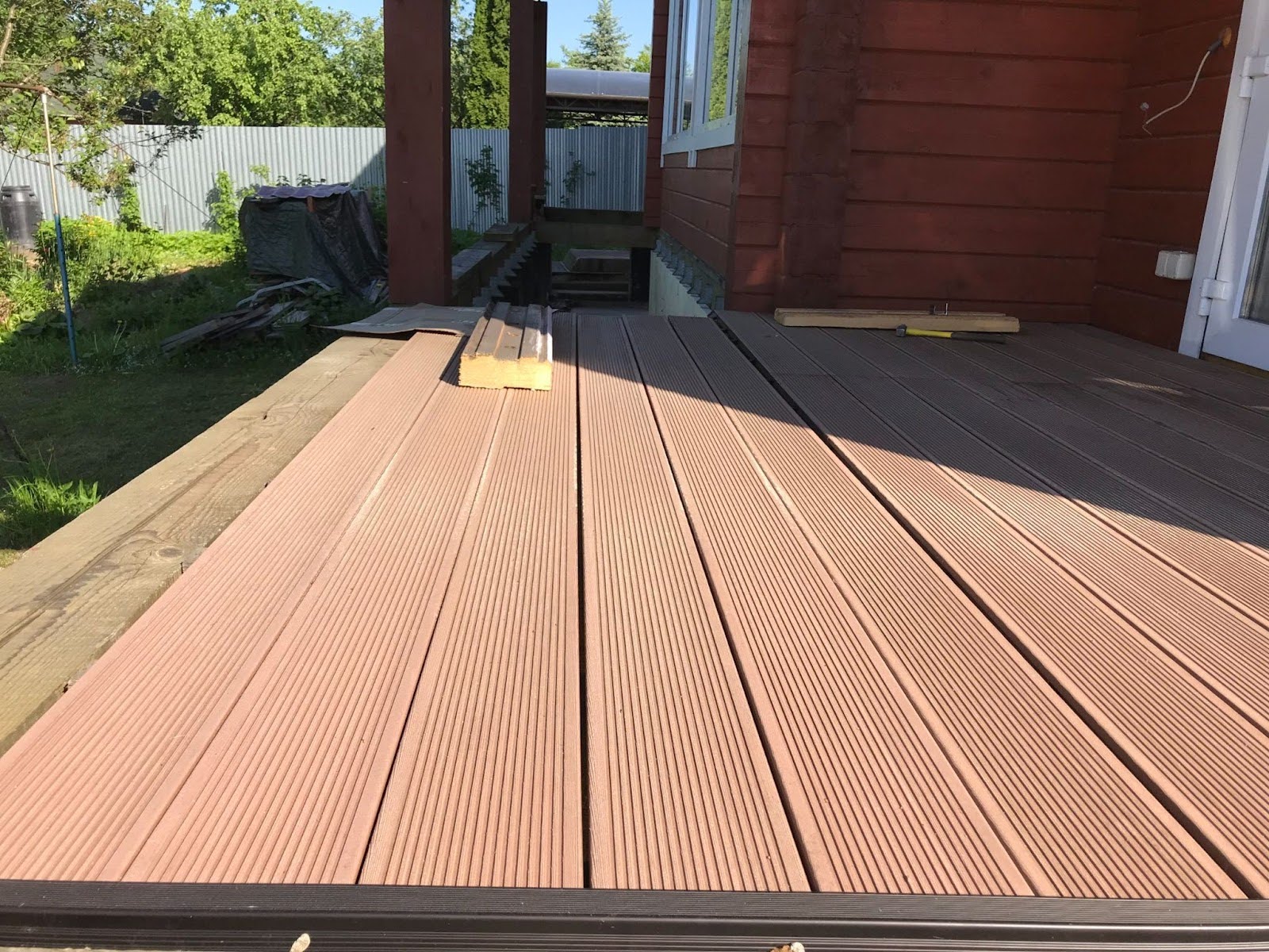 «Крыльцо с металлическим каркасом и ступеньками обшивали террасной доской из ДПК. Использовали открытое крепление саморезами по металлу. Да, шляпки видно, но зато конструкция очень крепкая. Даже при большой нагрузке ничего не шатается. Если бы делал ещё раз, поставил бы декоративные уголки на торцы — это улучшило бы внешний вид».